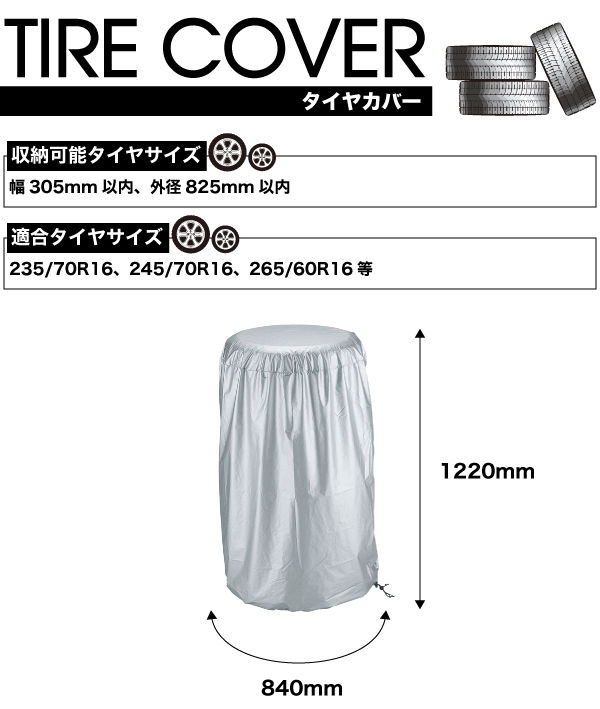 ●大事なタイヤを雨風から守るシルバーカバーです ●タイヤラック等置きづらいスペースに収納する際に ●交換用タイヤやスタッドレスタイヤを保管するのに便利です サイズ(約) 外径840×高さ1220mm 重量/230g 材質 ポリエステル(シルバーコーティング) 配送区分 【同梱OK】 備考 収納可能タイヤサイズ 幅305mm以内、外径825mm以内 適合タイヤサイズ 235/70R16、245/70R16、265/60R16等 メーカー希望小売価格はメーカーカタログに基づいて掲載していますタイヤガレージ軽自動車用 タイヤガレージ普通自動車用 タイヤガレージRV・大型車用 タイヤガレージ軽自動車用カバー タイヤガレージ普通自動車用カバー タイヤガレージRV・大型車用カバー タイヤカバー Sサイズ タイヤカバー Mサイズ タイヤカバー Lサイズ