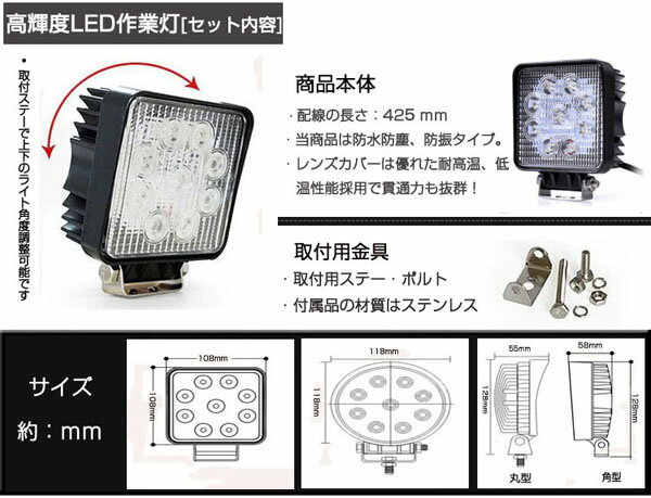 アルミ基板なので、高温にも耐えられる非常に優れた耐熱性・放熱性を実現!! 【主要用途】 トラックの荷台用の照明 フォークリフト・除雪車のライト 海苔漁・漁業の常夜灯、夜釣りの照明、集魚ライト キャンプなどでは車などのバッテリーに繋いで使用可能 【仕様】 電球数: 9個 発光色:ホワイト 電力:3W×9個=27W 動作電圧:DC12/24V兼用 色温度:6500K 防水レベル:IP67 ルーメン:1890LM 材質:アルミ合金ハウジング サイズ:( 10.8 x 10.8 x 5.8)cm (L x W x H)約 重量:784g約 商品内容:本体x 2 マウントアクセサリーx 10 【ご注意】 ※商品の外観や、パッケージおよびは品質向上の為、予告なくデザインを変更する場合がございまが、ご使用に関して問題は御座いませんのでご安心してお使い下さい。