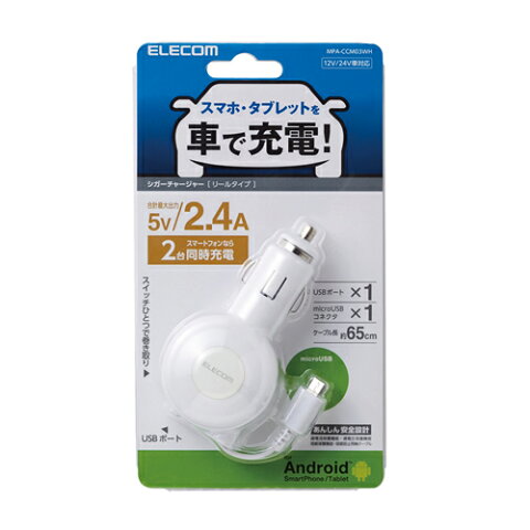 ■対応機種:microUSBコネクタまたはUSBポートから合計5V/2.4Aまでの出力で充電可能な機器■使用電源:アクセサリソケット■コネクタ形状:microUSB(Type-B)コネクタ(オス) USB(Type-A)ポート(メス)■定格入力電圧:DC12V/24V■定格出力電圧:DC5V■定格出力電流:合計最大出力2.4A■カラー:ホワイト■外形寸法:幅46×奥行85×高さ29mm(突起部含まず)■ケーブル長:約65cm■質量:約42g■保証期間:1年■使用可能地域:日本■付属品:なし■電気用品安全法:該当せず■その他:microUSB側は巻き取り式ケーブルエレコムダイレクトショップJANコード:4953103488717メーカー希望小売価格はメーカーサイトに基づいて掲載しています。