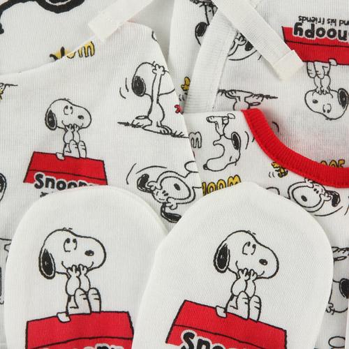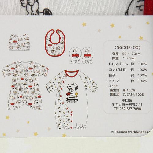かわいいベビーギフトが登場しました! プレゼントにもちょうどいい価格で人気のスヌーピー柄です 中にはドレスオール・コンビ肌着・帽子・ミトン・スタイが入っています。