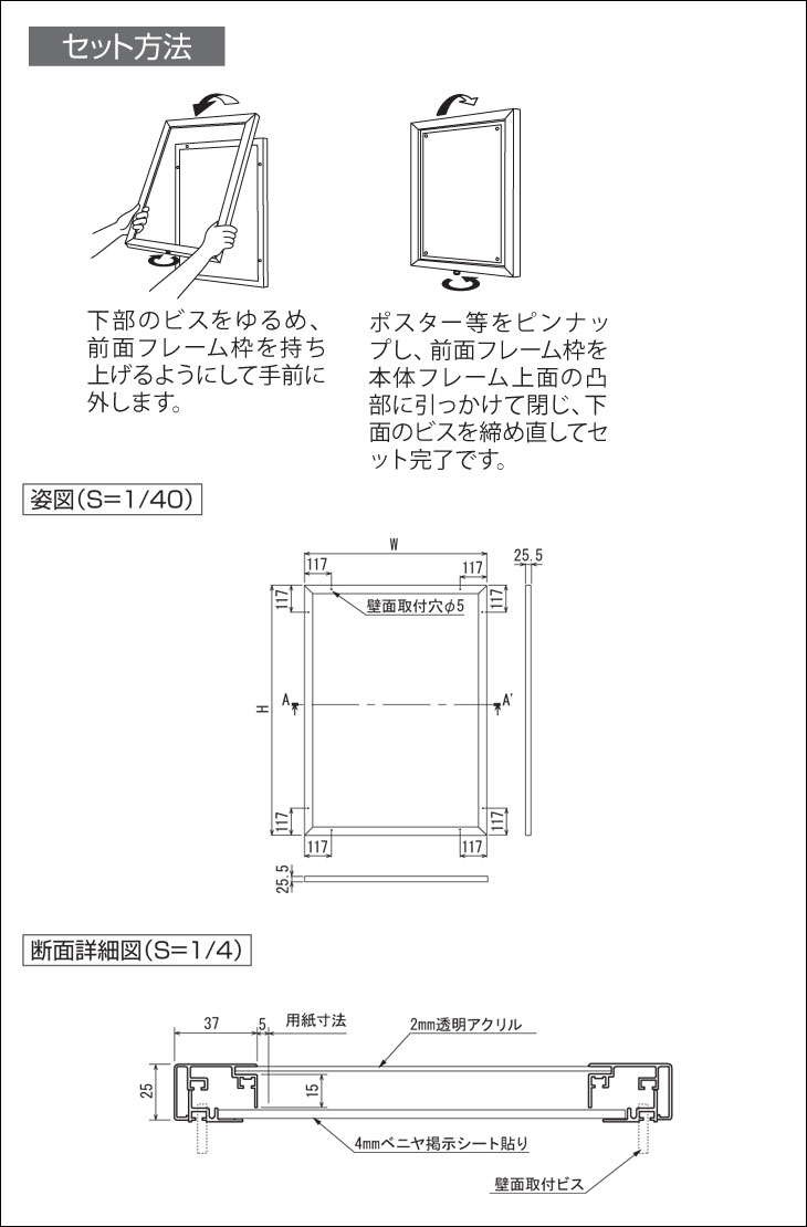 サイズ B1(728×1030mm) 外寸法(W×H×D) 812×1114×25mm 有効画面寸法 738×1040mm 重量 6.9kg 色 ステン・セピア 材質 ・フレーム:アルミ押出材 (ステン)アルマイト仕上 (セピア) 木目シート貼り仕上げ・面板:2mm透明アクリル/4mmベニヤ掲示シート貼り仕上 付属備品 吊り金具・吊りひも・直付け用ビス 納期 4日〜7日 ■他のサイズ A3(297×420mm) B3(364×515mm) A2(420×594mm) B2(515×728mm) ¥15,490 ¥17,190 ¥18,710 ¥20,790 A1(594×841mm) B1(728×1030mm) ¥22,580 ¥33,160