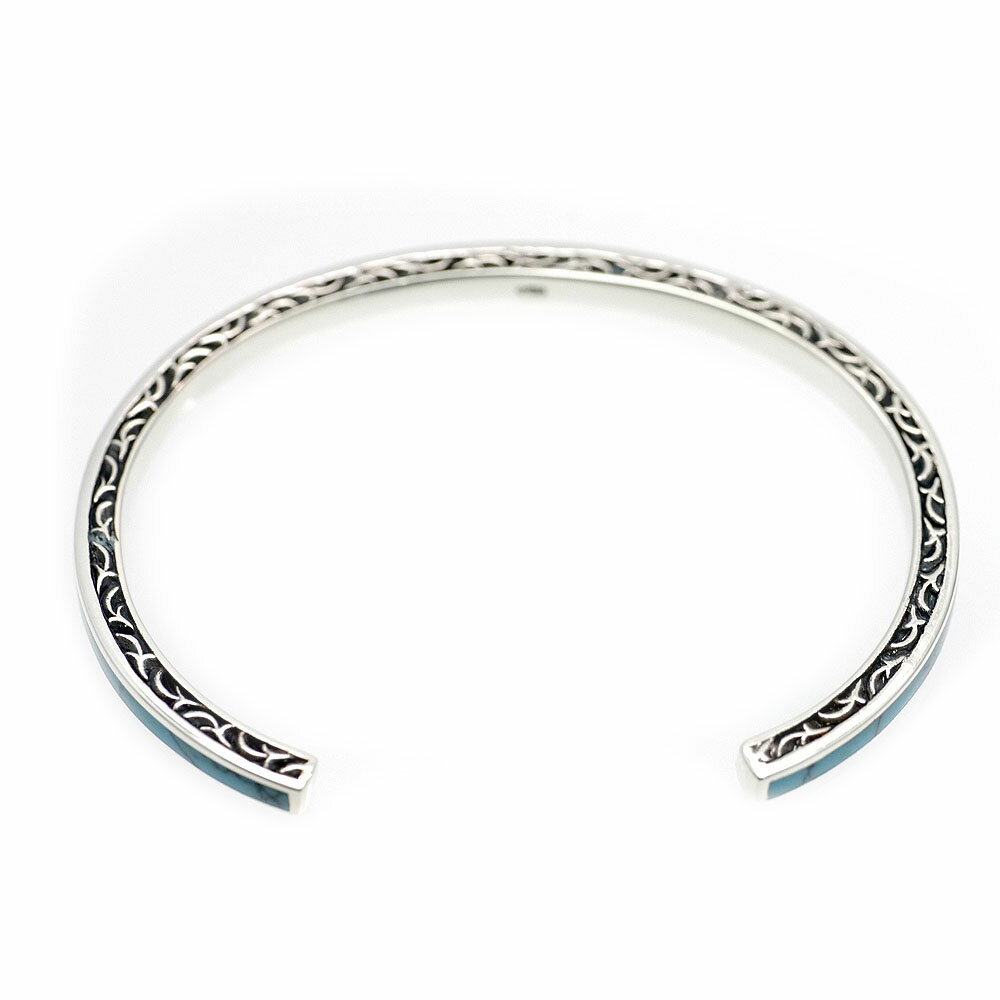■ブレスレットの仕様 内周:19cm〜フリーサイズ 太さ:4mm x 4mm 重さ:約18g 材質:シルバー925/ターコイズ --------------- 【バングルの着け方】 バングルには独特の着け方があります! 注:無理に開くと亀裂が入りますのでご注意下さい。