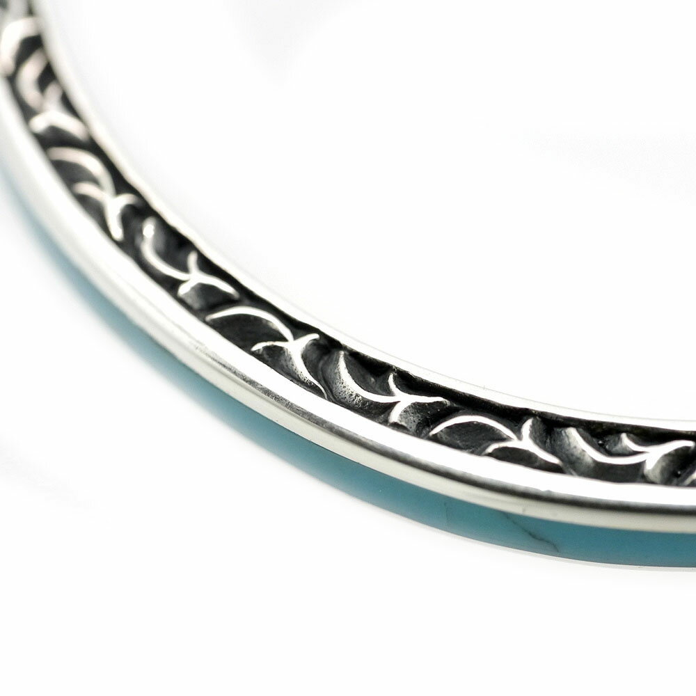 純銀素材の贅沢なネイティブ系バングル! 生命力の象徴であるアラベスクの彫金に、 空の色=自由の象徴と言われるターコイズ石がセットされています♪